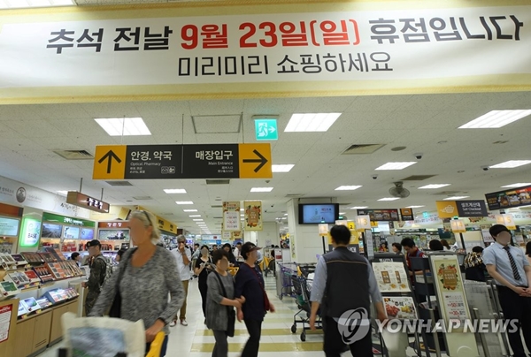 유통업계에 따르면 서울·인천·대전·대구·부산 등 대부분 지역은 추석 직전 일요일인 8일이 의무휴업일이고 추석 바로 전날인 12일이 의무휴업일인 곳도 있다.