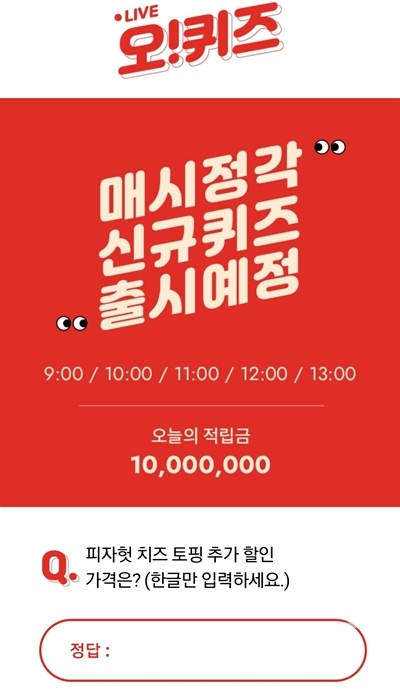 한편 오퀴즈는 제휴사 서비스의 특장점을 퀴즈로 소개하는 퀴즈 이벤트이다. 매시정각, 신규 퀴즈가 출제된다.