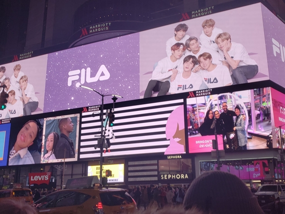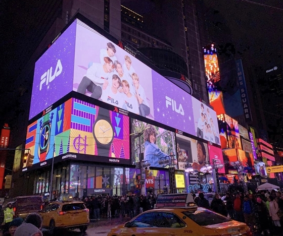 2020년 새해 벽두 휠라를 입은 글로벌 아티스트 방탄소년단의 모습이 미국 뉴욕 타임스스퀘어를 빼곡히 수놓으며 화제를 모았다.