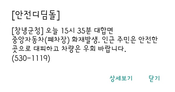 3일 오후 3시 35분께 창녕군 대합면 중앙자동차(폐차장)에서 화재가 발생했다. 창녕군청은 긴급문자를 발송해 “인근 주민은 안전한 곳으로 대피하고 차량은 우회 바란다”고 전했다.