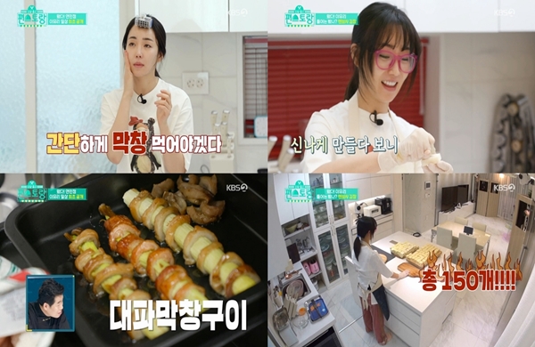 이어 이유리의 청순 민낯이 공개됐다. 무결점 피부와 민낯 미모에 감탄한 것도 잠시, 이유리는 아침부터 “간단하게 막창 먹어야겠다”고 말해 궁금증을 자아냈다. 이유리는 대파에 막창을 끼운 뒤 에어프라이기에 조리한 ‘대파 막창구이’를 만들었다. 여기에 마른 오징어를 불려서 끓인 찌개와 닭가슴살 샐러드까지. 흡사 저녁식사 같은 그녀만의 아침식사는 놀라움과 웃음을 안겨줬다.