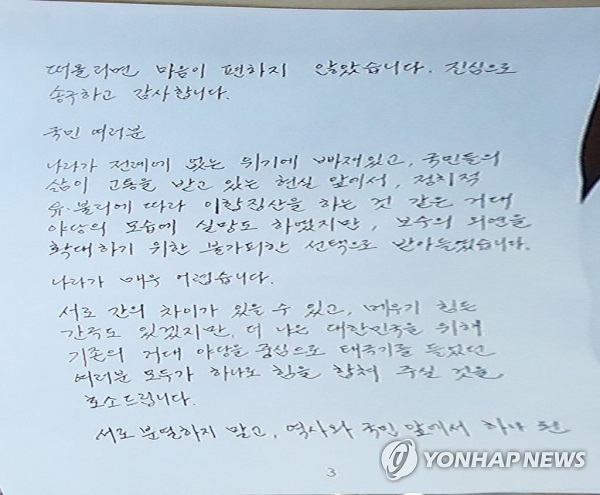 이어 “나라의 장래가 염려돼 태극기를 들고 광장에 모였던 수많은 국민들의 한숨과 눈물을 떠올리면 마음이 편하지 않았다. 진심으로 송구하고 감사하다”고 전하면서 신종 코로나바이러스 감염증(코로나19) 사태에 대해 “대구·경북 지역에서 4000명이 넘는 확진자가 발생했고 앞으로 더 많은 확진자가 발생할 수 있다고 하니 너무나 가슴이 아프다”며 “부디 잘 견디어 이겨내시기를 바란다”고 말했다.