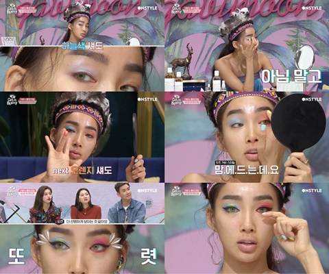 이어 봄느낌이 나는 메이크업을 위해 다양한 아이 메이크업 제품을 덧바른 뒤 “라이너를 얇지만 길게 빼겠다”며 문가비 특유의 라이너 비법을 공개했다.