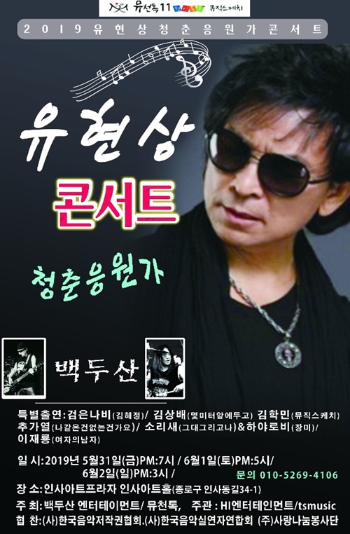 특히 '2019 유현상 청춘응원가 콘서트'에는 1986년 백두산의 리드 보컬 겸 리드 기타로 데뷔한 '유현상과 백두산'의 과거 소환 무대를 볼 수 있는 특별한 락 공연도 펼쳐진다.