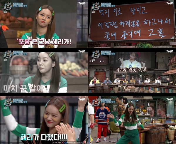이날 첫 번째 곡은 트와이스의 '팬시'였다. 혜리는 아이돌 그룹 가사의 특성을 생각하며 '마치 꿈 같아 볼 꼬집어 봐'라는 가사를 캐치해내며 활약했다.