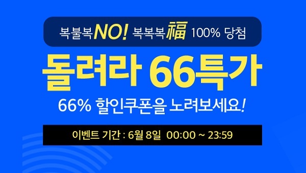 8일 위메프는 ‘돌려라 66특가’ 이벤트를 실시한다. 이 이벤트는 위메프 홈페이지에서 룰렛을 돌리는 방식으로 진행되며 660원 할인 쿠폰부터 100% 할인쿠폰까지 준비됐다.