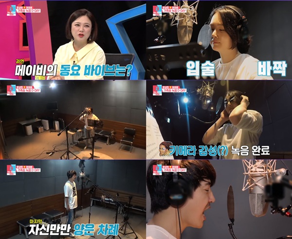 100회 특집으로 꾸며진 이날 방송에선 윤상현-메이비 부부와 아이들이 함께 가족송을 녹음했다. 메이비는 “어렸을 때 목소리를 담은 테이프가 있다. 컸을 때 들으니 좋아서 애들 목소리로 노래를 녹음해보면 어떨까 싶었다”고 말했다.
