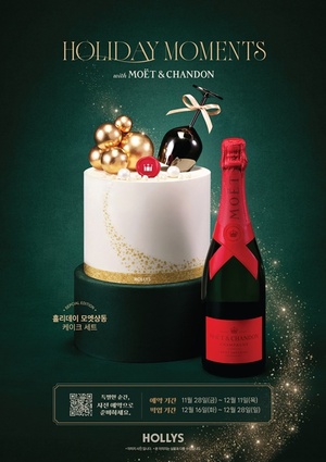 할리스가 연말 파티에 특별함을 더해줄 홀리데이 시즌 한정 홀케이크를 공개하고, 28일부터 사전 예약을 진행한다.할리스는 ‘샴페인처럼 반짝이는 홀리데이’를 컨셉으로 파티 분위기를 한껏 끌어올려 줄 시즌 한정 홀케이크를 선보인다. ‘홀리데이 샴페인 골드 케이크’는 샴페인을 터트리는 순간의 행복과 기쁨을 형상화한 케이크다. 270년 전통의 프랑스 대표 샴페인 ‘모엣 & 샹동’의 2025 엔드 오브 이어 리미티드 에디션 ‘모엣 샹동 임페리얼 750ml’와 함께 구성된 ‘홀리데이 모엣샹동 케이크 세트’도 마련돼 연말 파티를 위한 케이크를 찾