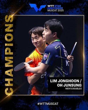 한국 남자 탁구 한국거래소 콤비인 임종훈과 오준성이 월드테이블테니스(WTT) 스타 컨텐더 무스카트 2025 정상에 올랐다.임종훈-오준성 조는 21일(현지 시간) 오만 무스카트에서 열린 대회 남자복식 결승에서 싱가포르의 팡 코엔-퀘크 아이작 조를 게임 점수 3-0(12-10 11-8 12-10)으로 완파했다.이로써 임종훈-안재현 조는 지난 6월 WTT 컨텐더 스코피예 우승 이후 5개월 만에 또 한 번 우승컵을 들어 올렸다.임종훈은 올해 류블라나·첸나이 대회 우승을 합작했던 '황금 콤비' 안재현(한국거래소)이 이번 대회에 출전하지 못하