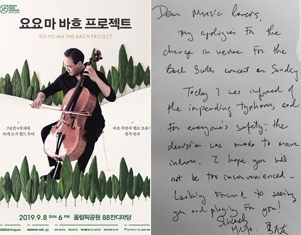 한편 첼리스트 요요 마는 장소 변경과 관련해 한국 관객들에게 "임박한 태풍 소식을 듣고 모든 이들의 안전을 위해 실내 공연장으로 장소를 옮기게 됐다"는 요지의 친필 메시지를 전해왔다.