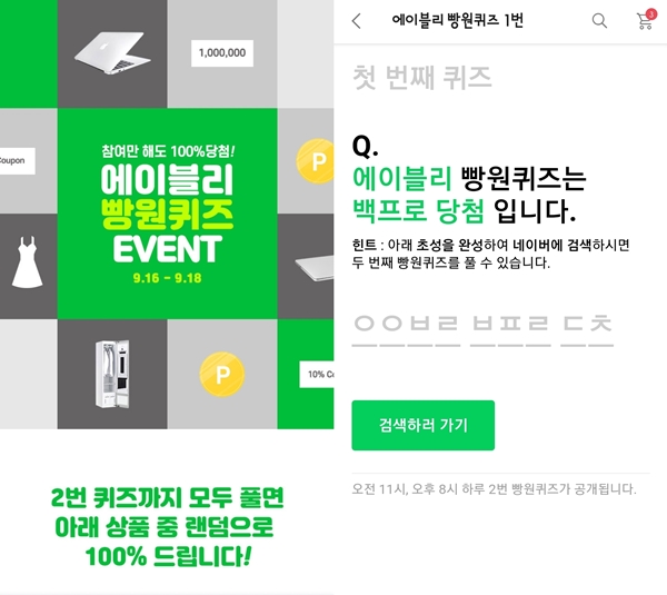 에이블리 빵원퀴즈는 에이블리 앱에 로그인한 뒤 퀴즈 이벤트 배너를 통해 모바일 환경에서 네이버 검색을 두 번 실시해야 참여 가능하다.