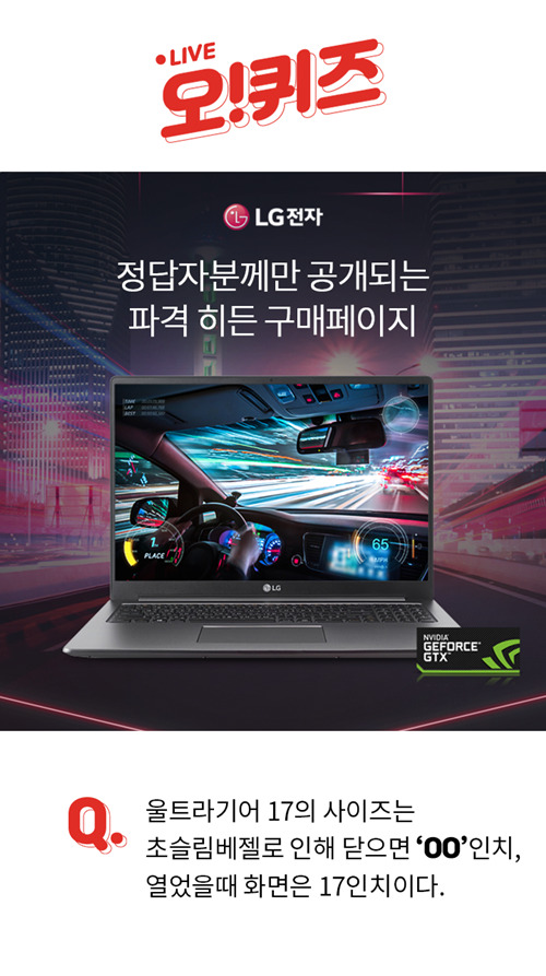 오후 3시 기준 출제된 문제는 "울트라기어 17의 사이즈는 초슬림베젤로 인해 닫으면 OO인치, 열었을 때 화면은 17인치이다"로 해당 문장 속 빈칸에 알맞은 숫자를 맞추면 된다.