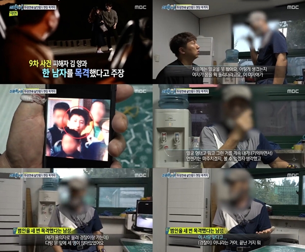 목격자는 범인을 세번 목격했다며 "언젠가는 마추치겠지 생각했다. 다방 문 앞에 세명이 앉아있었다. 특별본부수사가 있는 곳인데 그 중에 한 명이었다. 그때 경찰들에 '저 사람이야'라고 했다. 양복은 회색, 순모를 입었었다. 저 사람이라고 했는데 경찰이 우리 직원이라고 했다. 그래서 끝났다"고 회상했다.