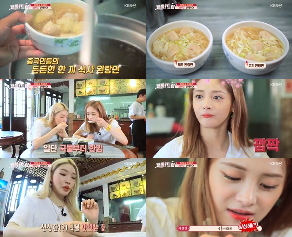 28일 방송된 KBS2 ‘배틀트립’에서 청하와 주결경이 광저우 투어를 떠났다. 이날 두 사람은 완탕면을 먹으로 식당을 찾았다.