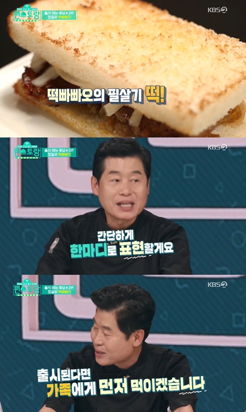 정일우는 간장 양념의 요리를 떡 사이에 끼우는 떡빠빠오를 만들어냈다.