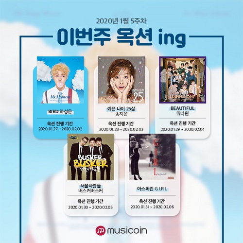 뮤지코인에서 금주의 핫 음악으로 하성운의 ‘벌드’의 저작권 공유를 시작했다. 금주 라인업에는 송지은 ‘예쁜 나이 21살’, 워너원 ‘뷰티풀’, 버스커버스커 ‘서울사람들’과 걸 ‘아스피린’이다.