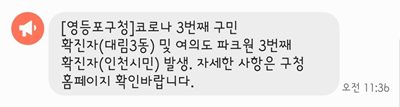 2일 영등포구청 측은 긴급 안전문자를 통해 "코로나19 세번째 구민 확진자가 발생하였다. 또한 여의도 파크원 건설현장 첫 확진자의 접촉자(인천시민)가 추가 확진판정 받았다"고 알렸다.