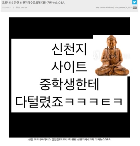 해당 페이지에는 이 문구와 함께 불상이 합성된 사진도 올라왔다. 이 페이지는 신천지 신도들이 코로나19에 대거 감염된 가운데 나오는 가짜뉴스에 신천지 측이 대응하기 위해 만들어졌다.