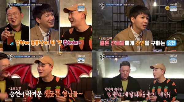 어제 방송에서는 김승현의 시끌벅적 신혼집 집들이 이야기가 그려졌다. 김승현은 개그맨 변기수, 윤형빈과 만남을 가졌다. 서로의 안부를 묻던 이들의 대화는 자연스럽게 결혼 생활로 이어졌고 김승현은 두 사람에게 결혼 생활 팁을 알려달라고 했다.