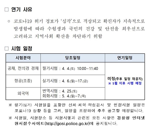 이에 따라 오는 4월 4일 실시될 예정이었던 공채 및 전의경 경력채용 필기 및 실기 시험일을 포함한 신체, 체력, 적성검사 및 면접시험 일정이 5월 이후로 연기됐다. 변경된 일정은 경찰청 내부에서 조정 후 공고할 예정이다.