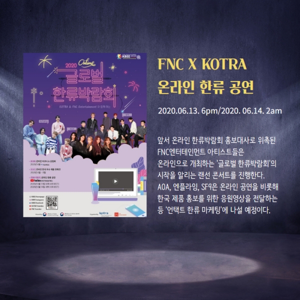 AOA, 엔플라잉, SF9은 온라인 공연을 비롯해 한국 제품 홍보를 위한 응원영상을 전달하는 등 '언택트 한류 마케팅'에 나설 예정이다.