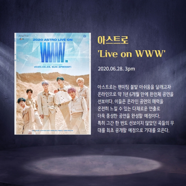 아스트로는 팬미팅 불발 아쉬움을 달래고자 온라인으로 약 1년 6개월 만에 완전체 공연을 선보이다. 이들은 온라인 공연의 매력을 온전히 느낄 수 있는 다채로운 연출로 더욱 풍성한 공연을 완성할 예정이다.
