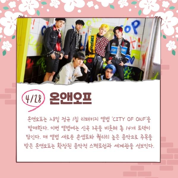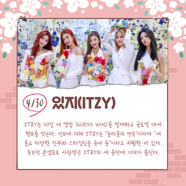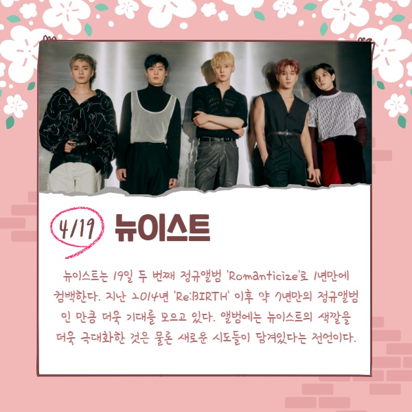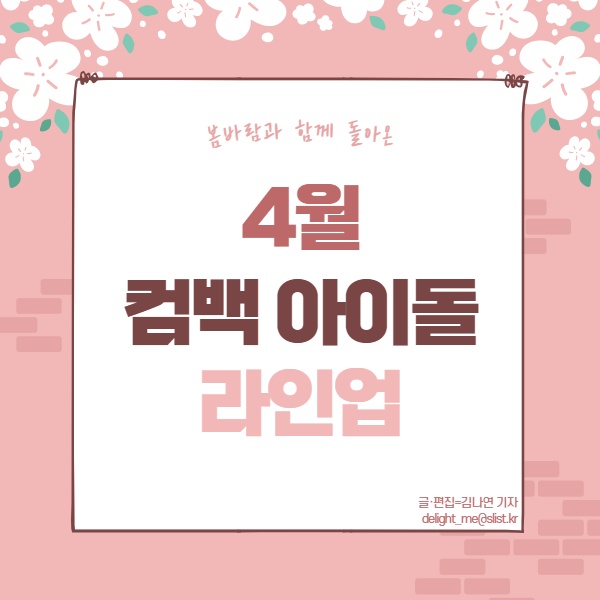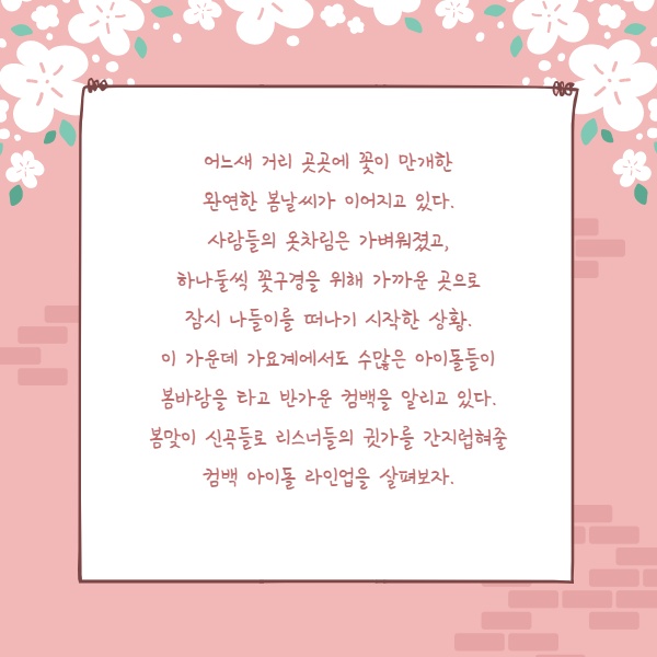어느새 거리 곳곳에 꽃이 만개한 완연한 봄날씨가 이어지고 있다. 사람들의 옷차림은 가벼워졌고, 하나둘씩 꽃구경을 위해 가까운 곳으로 잠시 나들이를 떠나기 시작한 상황. 이 가운데 가요계에서도 수많은 아이돌들이 봄바람을 타고 반가운 컴백을 알리고 있다. 봄맞이 신곡들로 리스너들의 귓가를 간지럽혀줄 컴백 아이돌 라인업을 살펴보자.