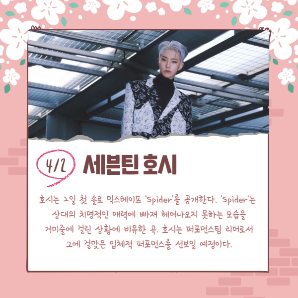 호시는 2일 첫 솔로 믹스테이프 'Spider'를 공개한다. 'Spider'는 상대의 치명적인 매력에 빠져 헤어나오지 못하는 모습을 거미줄에 걸린 상황에 비유한 곡. 호시는 퍼포먼스팀 리더로서 그에 걸맞은 입체적 퍼포먼스를 선보일 예정이다.