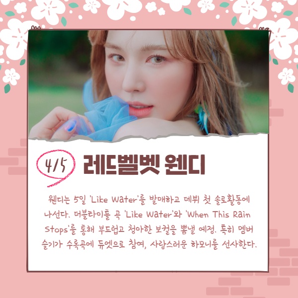 웬디는 5일 'Like Water'를 발매하고 데뷔 첫 솔로활동에 나선다. 더블타이틀 곡 'Like Water'와 'When This Rain Stops'를 통해 부드럽고 청아한 보컬을 뽐낼 예정. 특히 멤버 슬기가 수록곡에 듀엣으로 참여, 사랑스러운 하모니를 선사한다.