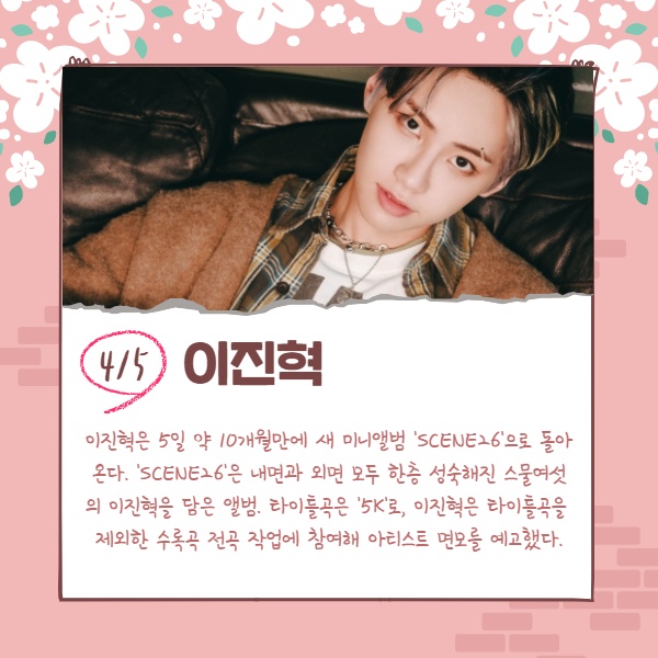 이진혁은 5일 약 10개월만에 새 미니앨범 'SCENE26'으로 돌아온다. 'SCENE26'은 내면과 외면 모두 한층 성숙해진 스물여섯의 이진혁을 담은 앨범. 타이틀곡은 '5K'로, 이진혁은 타이틀곡을 제외한 수록곡 전곡 작업에 참여해 아티스트 면모를 예고했다.