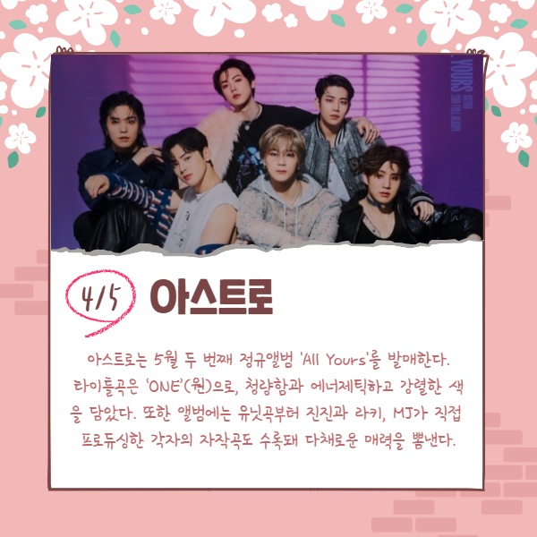 아스트로는 5월 두 번째 정규앨범 'All Yours'를 발매한다. 타이틀곡은 ‘ONE’(원)으로, 청량함과 에너제틱하고 강렬한 색을 담았다. 또한 앨범에는 유닛곡부터 진진과 라키, MJ가 직접 프로듀싱한 각자의 자작곡도 수록돼 다채로운 매력을 뽐낸다.