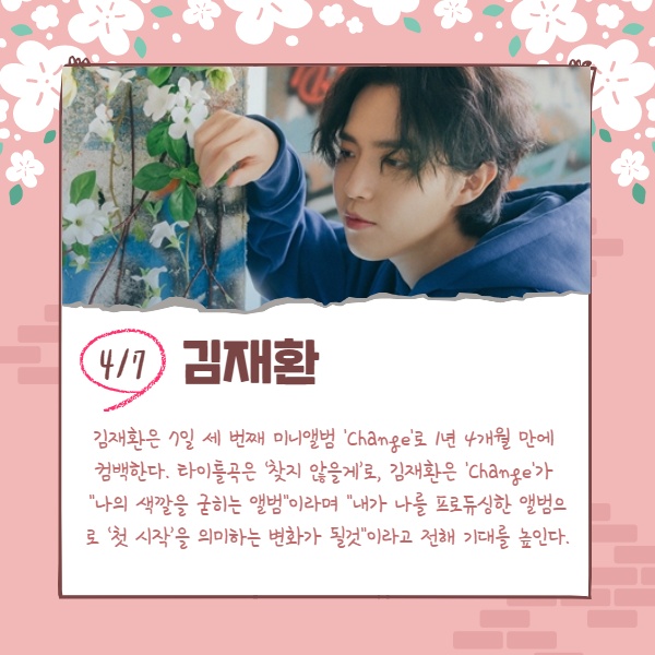 김재환은 7일 세 번째 미니앨범 'Change'로 1년 4개월 만에 컴백한다. 타이틀곡은 ‘찾지 않을게’로, 김재환은 'Change'가 "나의 색깔을 굳히는 앨범"이라며 "내가 나를 프로듀싱한 앨범으로 ‘첫 시작’을 의미하는 변화가 될것"이라고 전해 기대를 높인다.