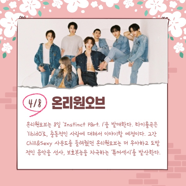 온리원오브는 8일 'Instinct Part. 1'을 발매한다. 타이틀곡은 'libidO'로, 충동적인 사랑에 대해서 이야기할 예정이다. 그간 Chill&Sexy 사운드를 들려줬던 온리원오브는 더 우아하고 도발적인 음악을 선사, 보호본능을 자극하는 '퓨어섹시'를 발산한다.