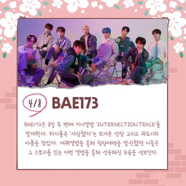 BAE173은 8일 두 번째 미니앨범 'INTERSECTION:TRACE'를 발매한다. 타이틀곡 ‘사랑했다’는 뜨거운 성장 그리고 과도기의 아픔을 담았다. 데뷔앨범을 통해 청량매력을 발산했던 이들은 그 스토리를 잇는 이번 앨범을 통해 성숙해진 모습을 선보인다.