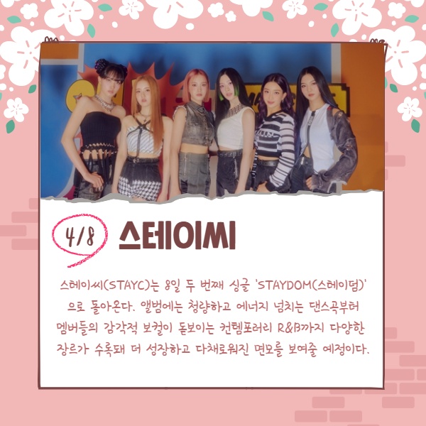 스테이씨(STAYC)는 8일 두 번째 싱글 'STAYDOM(스테이덤)'으로 돌아온다. 앨범에는 청량하고 에너지 넘치는 댄스곡부터 멤버들의 감각적 보컬이 돋보이는 컨템포러리 R&B까지 다양한 장르가 수록돼 더 성장하고 다채로워진 면모를 보여줄 예정이다.