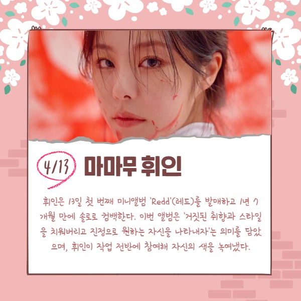 휘인은 13일 첫 번째 미니앨범 'Redd'(레드)를 발매하고 1년 7개월 만에 솔로로 컴백한다. 이번 앨범은 '거짓된 취향과 스타일을 치워버리고 진정으로 원하는 자신을 나타내자'는 의미를 담았으며, 휘인이 작업 전반에 참여해 자신의 색을 녹여냈다.