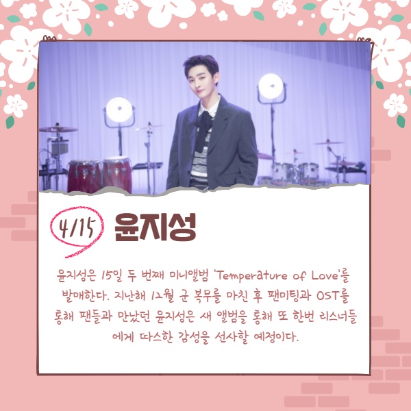 윤지성은 15일 두 번째 미니앨범 'Temperature of Love'를 발매한다. 지난해 12월 군 복무를 마친 후 팬미팅과 OST를 통해 팬들과 만났던 윤지성은 새 앨범을 통해 또 한번 리스너들에게 따스한 감성을 선사할 예정이다.