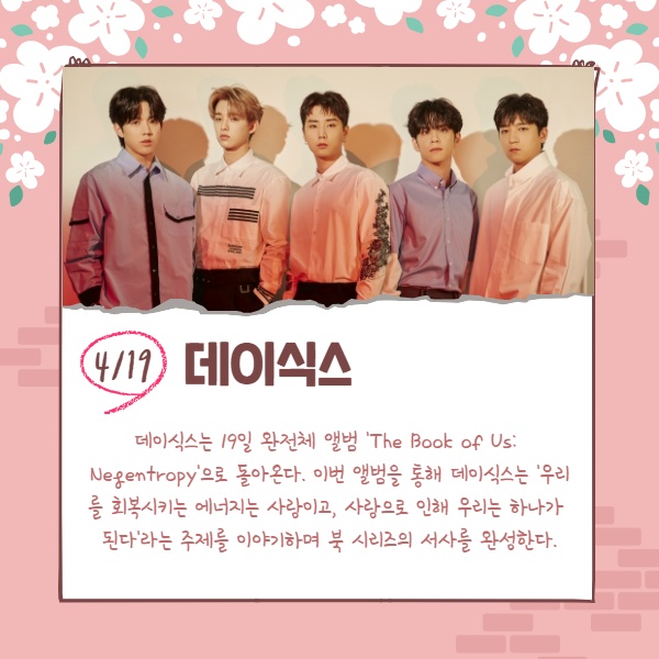 데이식스는 19일 완전체 앨범 'The Book of Us: Negentropy'으로 돌아온다. 이번 앨범을 통해 데이식스는 '우리를 회복시키는 에너지는 사랑이고, 사랑으로 인해 우리는 하나가 된다'라는 주제를 이야기하며 북 시리즈의 서사를 완성한다.