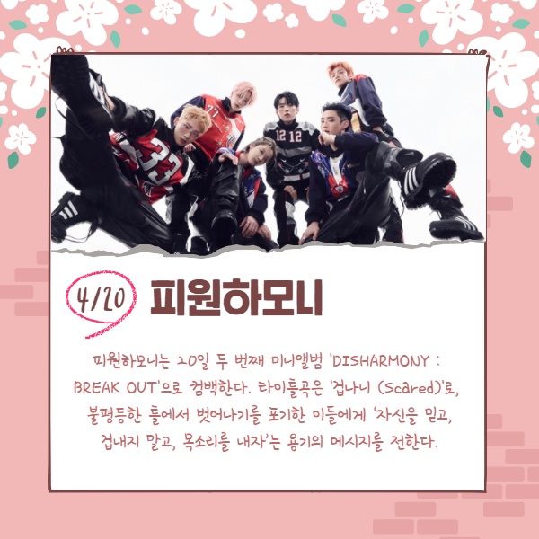 피원하모니는 20일 두 번째 미니앨범 'DISHARMONY : BREAK OUT'으로 컴백한다. 타이틀곡은 '겁나니 (Scared)'로, 불평등한 틀에서 벗어나기를 포기한 이들에게 ‘자신을 믿고, 겁내지 말고, 목소리를 내자’는 용기의 메시지를 전한다.