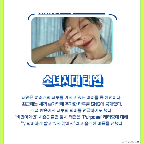 태연도 여러개의 타투를 가지고 있는 아이돌 중 한명이다.