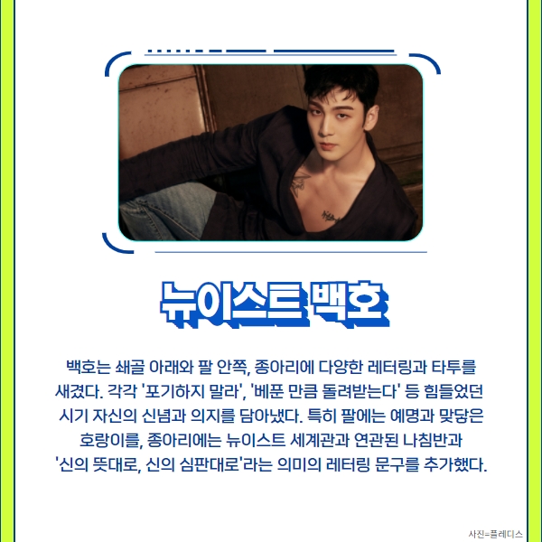 백호는 쇄골 아래와 팔 안쪽, 종아리에 다양한 레터링과 타투를