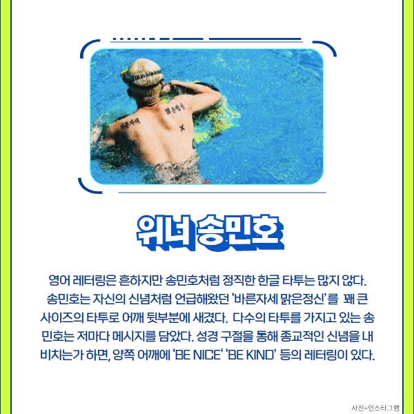영어 레터링은 흔하지만 송민호처럼 정직한 한글 타투는 많지 않다.