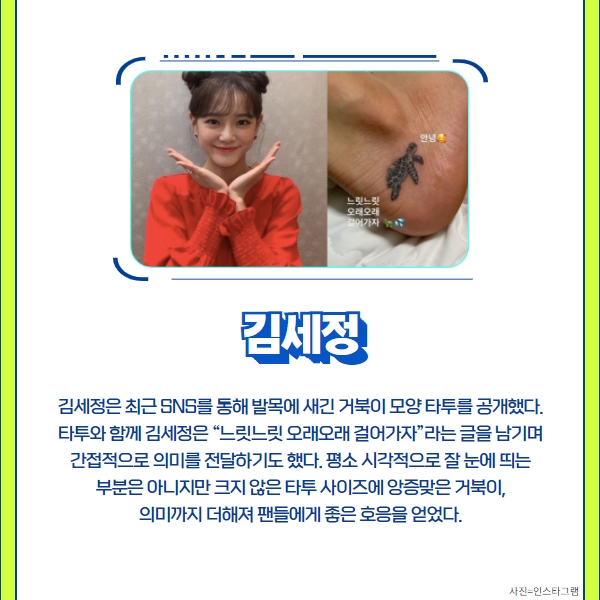 타투와 함께 김세정은 “느릿느릿 오래오래 걸어가자”라는 글을 남기며