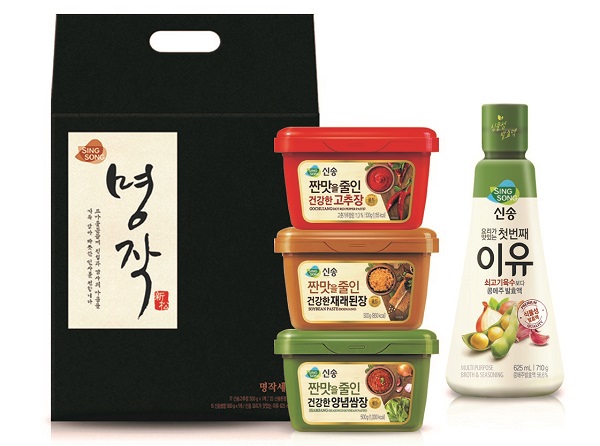 신송식품이 선보인 ‘명작4호 선물세트(3만1천원)’는 ‘짠맛을 줄인 건강한 장류 시리즈’인 고추장, 재래된장, 양념쌈장과 천연 액상 조미료인 ‘요리가 맛있는 첫 번째 이유’로 구성돼, 새해를 맞은 다이어터에게 건강하고 맛있는 식탁을 선물한다는 의도로 만들어졌다.