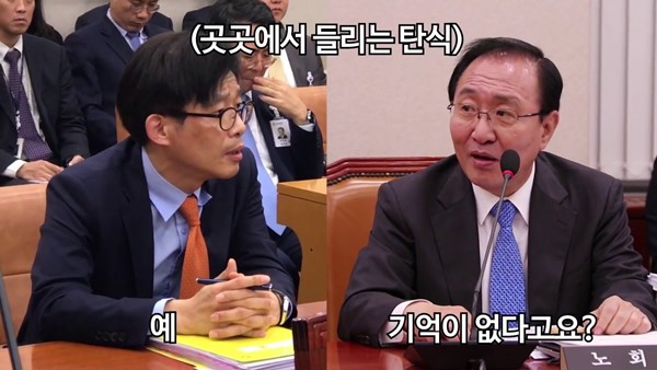 # 둘. 박근혜 정부 시절인 2016년 11월, 검찰 인사를 쥐락펴락하는 법무부 검찰국장이던 그는 국회 법제사법위원회에 나와 노회찬 정의당 의원으로부터 ‘부산 엘시티 비리 관련 의혹 사건’과 관련해 우병우 전 청와대 민정수석 등에게 보고한 적이 있느냐는 질문을 받았다. 그러자 “기억에 없습니다”라고 말한 뒤 “보고를 안 했을 수도 있고요” “모르겠습니다”라고 불성실한 답변을 이어갔다. 입꼬리엔 웃음마저 걸려 있었다. 안하무인 태도에 어이없어 하던 노회찬 의원은 “막장입니다. 막장이에요”라고 말하며 질의를 마쳤다.