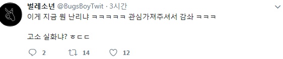 벌레소년은 30일 자신의 트위터에 “이게 지금 뭔 난리냐. 관심 가져주셔서 감사. 고소 실화냐?”라는 글을 올렸다. 이는 자신이 올린 ‘평창유감’ 영상이 화제를 모으면서 논란까지 불거지자 올린 글로 추측된다.