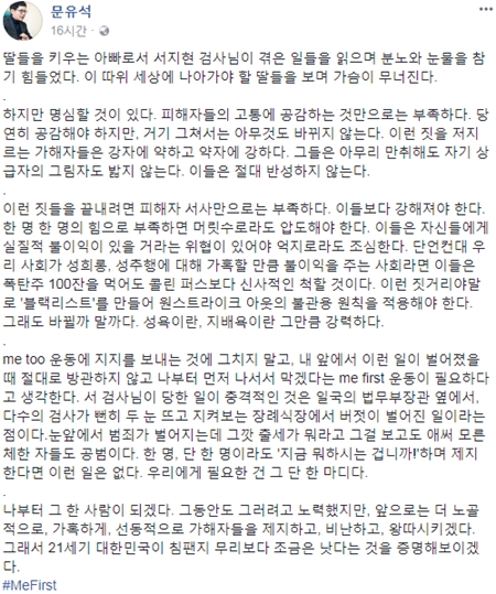 문유석(49) 서울동부지법 부장판사가 최근 벌어진 검찰 내 성폭력 사건 관련 '미 퍼스트(#MeFirst)' 운동을 제안했다. 성폭력 피해 고발 캠페인 '미투(#MeToo)' 운동에 연대의 뜻을 보낸 것이다.