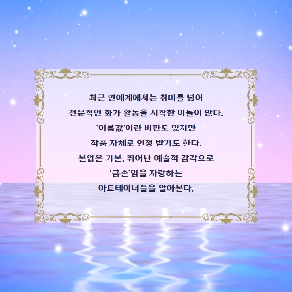 최근 연예계에서는 취미를 넘어 전문적인 화가 활동을 시작한 이들이 많다. '이름값'이란 비판도 있지만 작품 자체로 인정 받기도 한다. 본업은 기본, 뛰어난 예술적 감각으로 '금손'임을 자랑하는 아트테이너들을 알아본다.