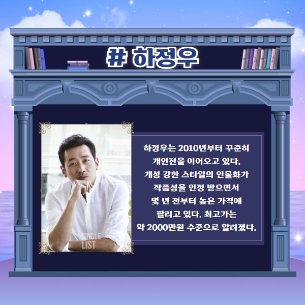 하정우는 2010년부터 꾸준히 개인전을 이어오고 있다. 개성 강한 스타일의 인물화가 작품성을 인정 받으면서 몇 년 전부터 높은 가격에 팔리고 있다. 최고가는 약 2000만원 수준으로 알려졌다.