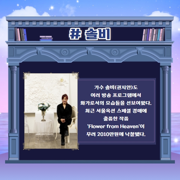 가수 솔비(권지안)도 여러 방송 프로그램에서 화가로서의 모습들을 선보여왔다. 최근 서울옥션 스페셜 경매에 출품한 작품 'Flower from Heaven'이 무려 2010만원에 낙찰됐다.